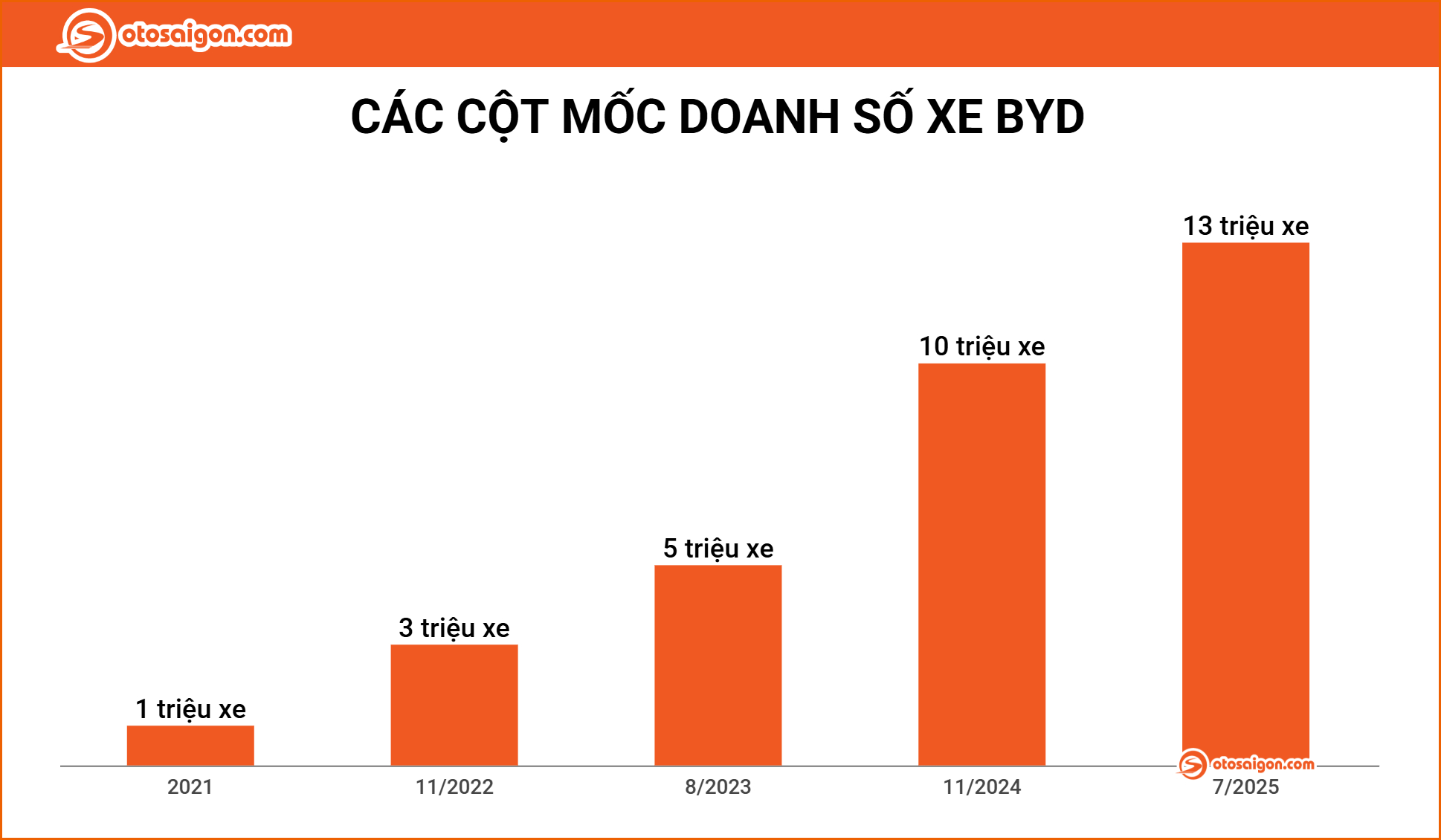 Sau hơn một thập kỷ kiên trì theo đuổi định hướng xe xanh, BYD đạt mốc doanh số 1 triệu xe NEV vào năm 2021. Từ đó, tốc độ tăng trưởng của hãng tăng vọt. Tới tháng 8/2023, doanh số xe NEV vượt 5 triệu chiếc. Chỉ một năm sau, vào tháng 9/2024, con số này đã lên tới 9 triệu. Chưa đầy 2 tháng tiếp theo, BYD đạt mốc 10 triệu xe (tháng 11/2024), và đến tháng 7 năm 2025, hãng tiếp tục chạm đỉnh mới với 13 triệu xe xuất xưởng.