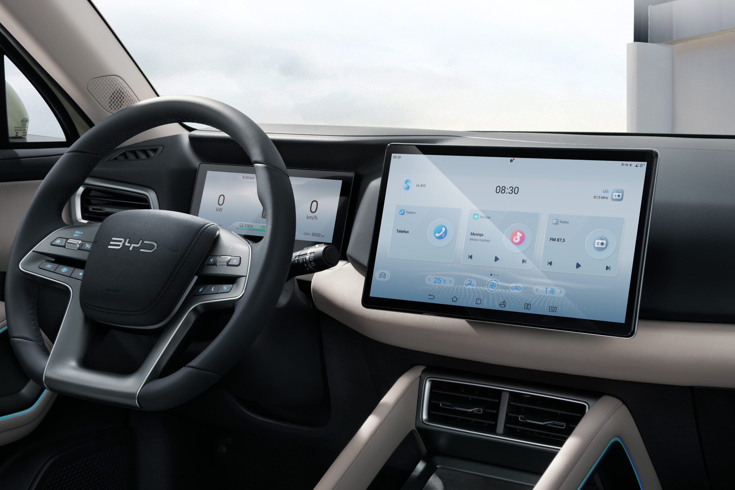 Nội thất của BYD ATTO 2 được chế tác với ghế ngồi bọc da thuần chay (vegan) bóng bẩy, thân thiện với môi trường cùng các vật liệu chất lượng cao xuyên suốt trên bảng điều khiển và các tấm ốp cửa.