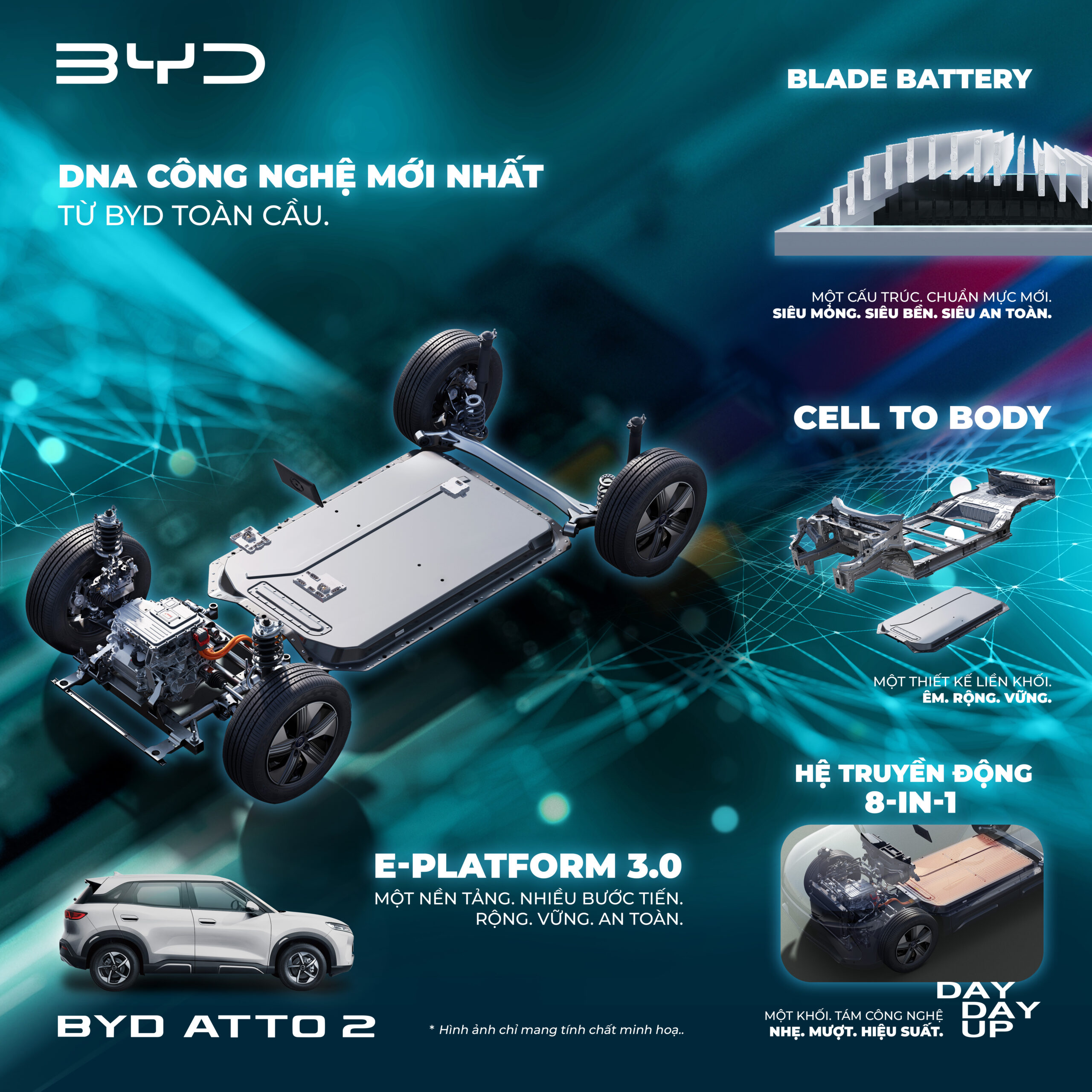 Sức mạnh của BYD nằm ở việc sở hữu toàn diện chuỗi cung ứng, từ khâu lên ý tưởng cho đến khi hoàn thiện sản phẩm. BYD tích hợp liền mạch vào mọi mẫu xe, bao gồm cả BYD ATTO 2: bộ điều khiển VCU, hệ thống quản lý pin BMS, bộ điều khiển động cơ MCU, bộ phân phối điện PDU, bộ chuyển đổi DC-DC, bộ sạc tích hợp, động cơ và hộp số. Sự đổi mới này đã dẫn đến hệ truyền động điện 8 trong 1 được sản xuất hàng loạt đầu tiên trên thế giới. Bằng cách kết hợp các bộ phận này một cách chuyên nghiệp, BYD tối đa hóa việc sử dụng không gian và nâng cao hiệu quả sử dụng năng lượng để mang đến một trải nghiệm lái SUV điện đột phá.